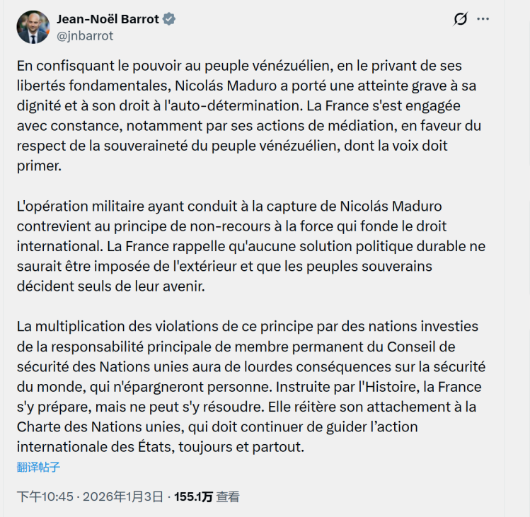 法国外交部长让-诺埃尔·巴罗表示,美国在委内瑞拉的行动破坏了国际法。“导致尼古拉斯·马杜罗被俘的军事行动违反了XM外汇官网禁止使用武力的国际法原则。法国重申,任何持久的政治解决方案都不能由外部强加,只有主权国家人民才能决定自己的未来。”